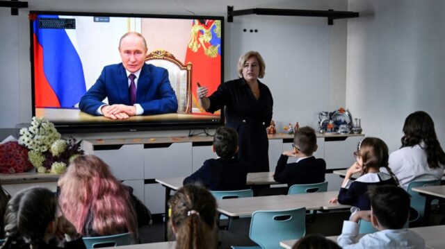 Início APOSTAS A propaganda de Putin na sala de aula inclui passos de ganso...