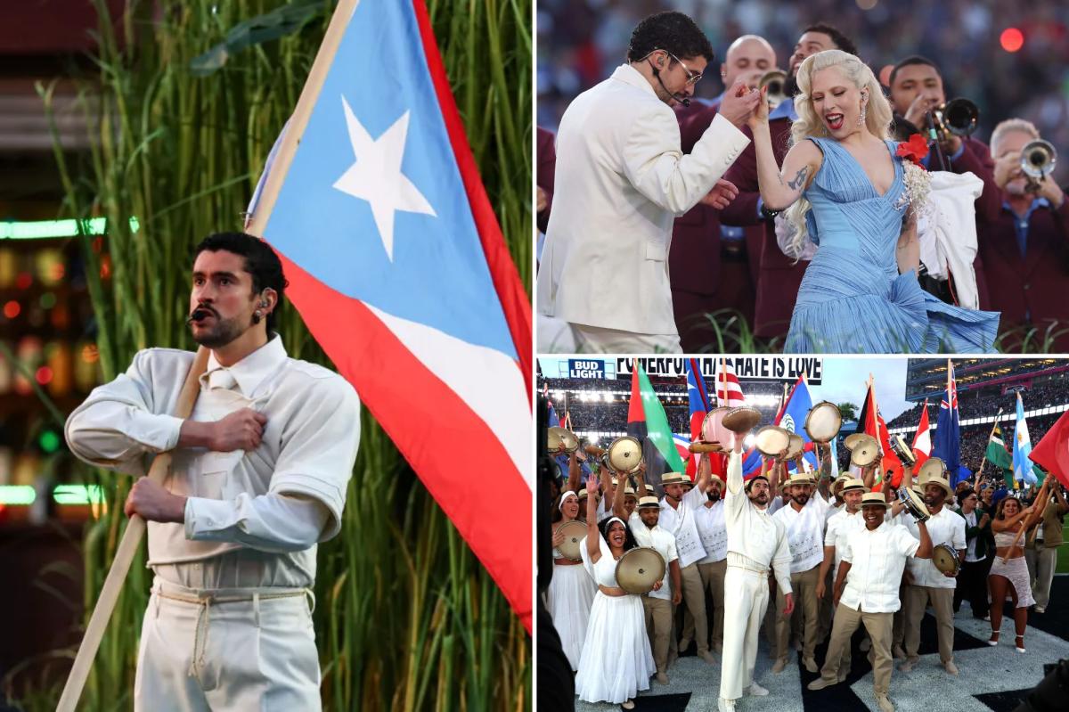 Perto do final do show do intervalo, Bad Bunny emergiu dos exuberantes campos de cana-de-açúcar agitando uma bandeira porto-riquenha enquanto era cercado por dançarinos que se faziam passar por trabalhadores de linhas de energia.