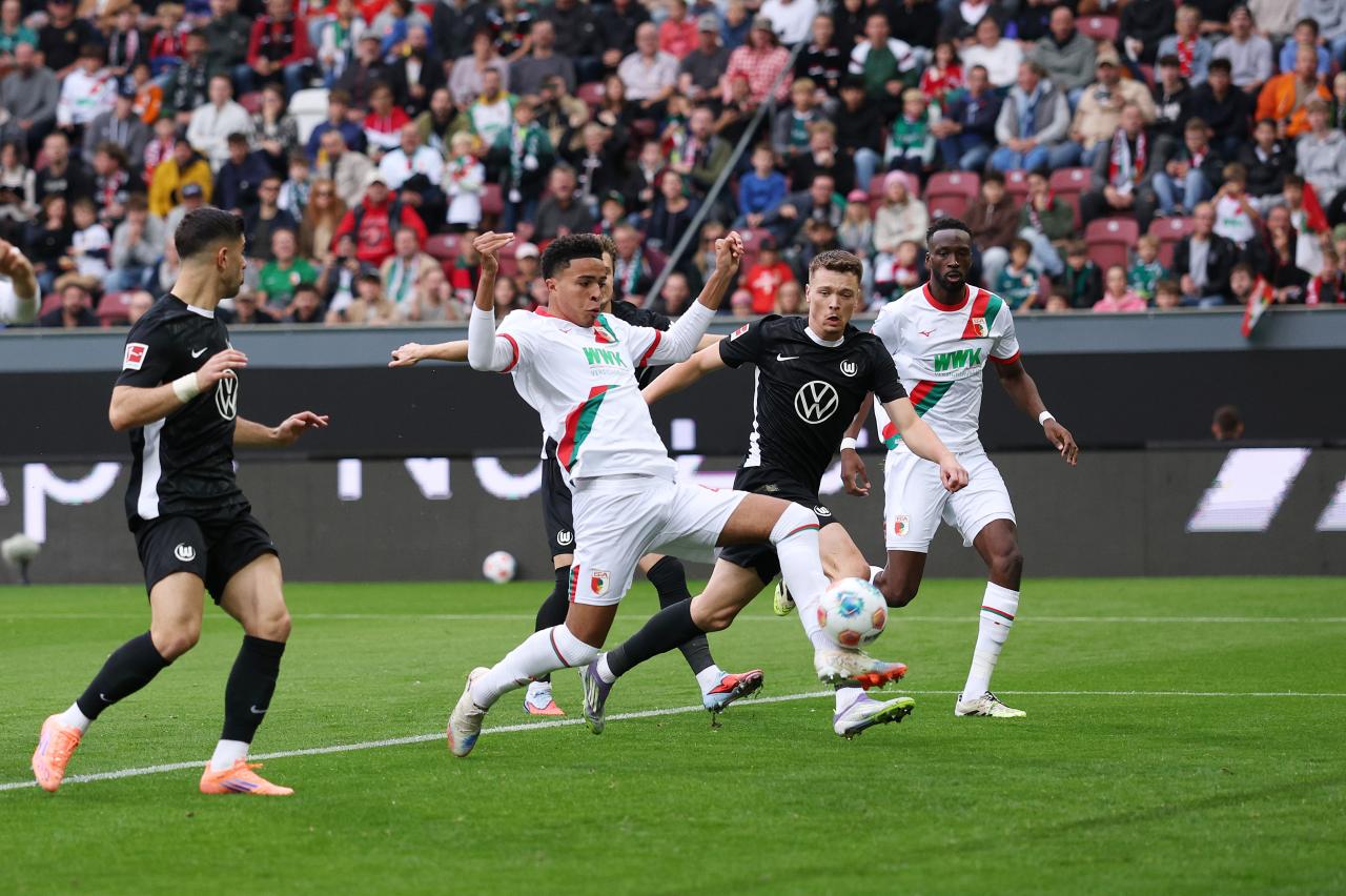 | Noahkai Banks marcou o primeiro gol do FC Augsburg contra o VfL Wolfsburg, em 4 de outubro de 2025. | (Foto de Adam Pretty/Getty Images) |