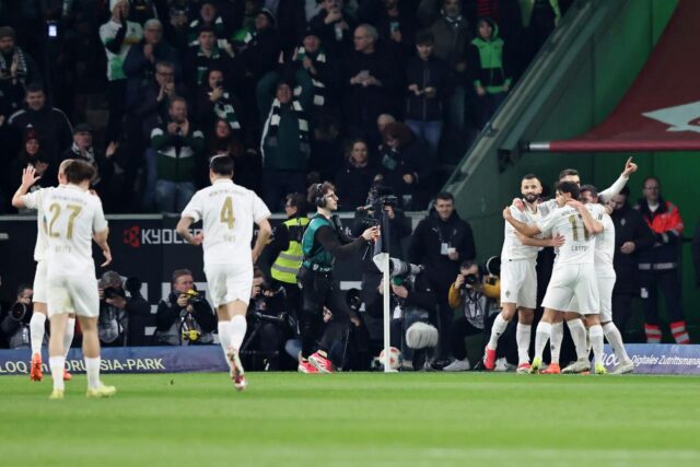 | Gladbach comemora gol de Engelhardt contra Leverkusen – 7 de fevereiro de 2026 | Foto de Christof Koepsel/Getty Images |