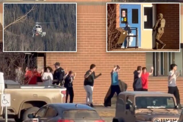 Os alunos levantaram as mãos enquanto eram escoltados para fora de um prédio escolar na Colúmbia Britânica. @JarrydJaeger/X
