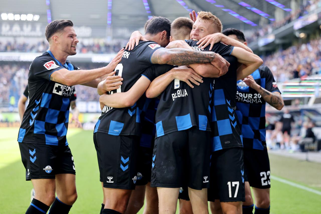 | Filip Bilbija, do SC Paderborn, comemora o segundo gol com seus companheiros durante a 2. Bundesliga x Holstein Kiel | Foto de Christof Koepsel/Getty Images |