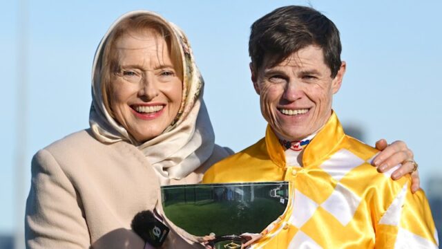 O treinador Gai Waterhouse e o jóquei Craig Williams depois que Sir Delius venceu o Turnbull Stakes em Flemington.Crédito: Imagens Getty