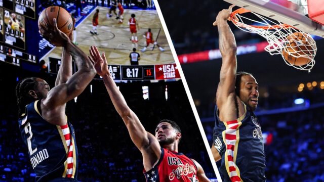 Kawhi Leonard marcou 31 pontos em 12 minutos pelo USA Stripes contra o Mundial no All-Star Game Championship em Los Angeles.