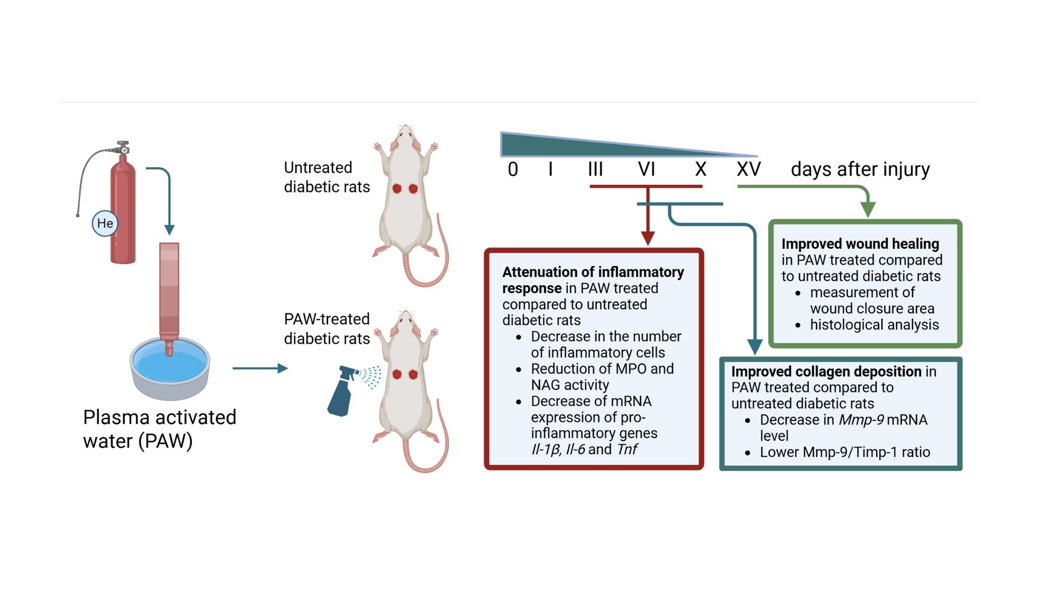 A pesquisa mostrou que o tratamento com água ativada por plasma (PAW) melhora significativamente o fechamento de feridas em ratos diabéticos em comparação com animais não tratados. Nos primeiros dias de cicatrização, as feridas tratadas com água ativada por plasma apresentam recuperação mais rápida e crescimento saudável dos tecidos. Notavelmente, a água ativada por plasma não alterou os níveis de açúcar no sangue, o que significa que os benefícios observados foram específicos do processo de cura. Dr. De acordo com Puak e colegas, “PAW melhorou a cicatrização de feridas em ratos diabéticos e afetou principalmente a fase inflamatória da cicatrização de feridas”.