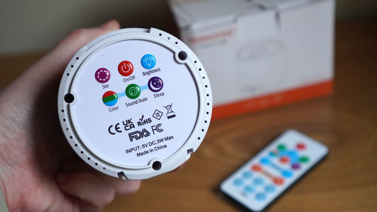 O controle remoto que vem com bateria pré-instalada é muito útil para controlar projeções. Você pode mudar Alguns As configurações são baseadas na própria unidade, mas com o controle remoto você pode alterar facilmente o brilho, a velocidade e a cor das projeções da nebulosa. Você pode ativar ou desativar estrelas e definir o tempo de suspensão.