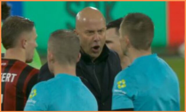 Veja abaixo como Slot pode ser visto gritando na cara dos árbitros, enquanto o capitão do LFC, Virgil van Dijk, também parecia longe de estar feliz com eles…