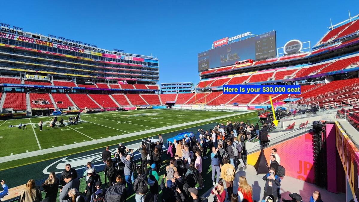 Basicamente, você pode comprar um carro ou assistir ao Super Bowl. Você sabe o que? Esqueça o carro, vamos ao Super Bowl. Então, quão perto você estará do campo se comprar este ingresso? Vamos dar uma olhada.