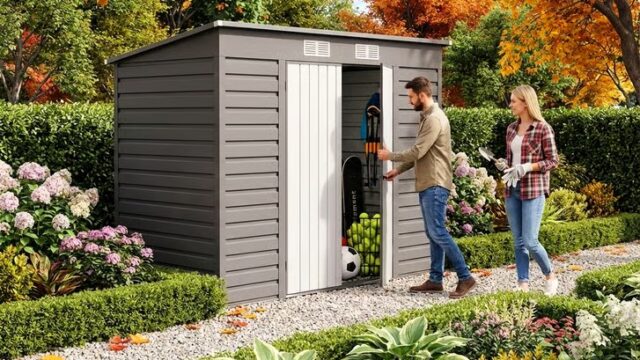 É um galpão externo de 6 pés x 4 pés feito de painéis de aço galvanizado, por isso foi construído para resistir à ferrugem e praticamente livre de manutenção – ideal se você quiser colocá-lo e esquecê-lo na maior parte do ano.