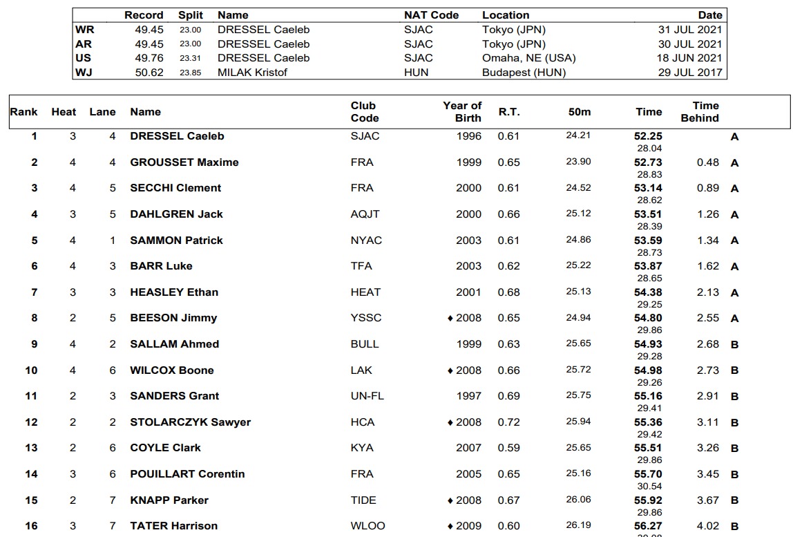 Clube de natação de Indiana De Mathias (26,57) e Finn Brooks (27.05) ficou com os dois primeiros colocados, enquanto o companheiro de equipe Brian Benzing ficou em quarto lugar (27,67).