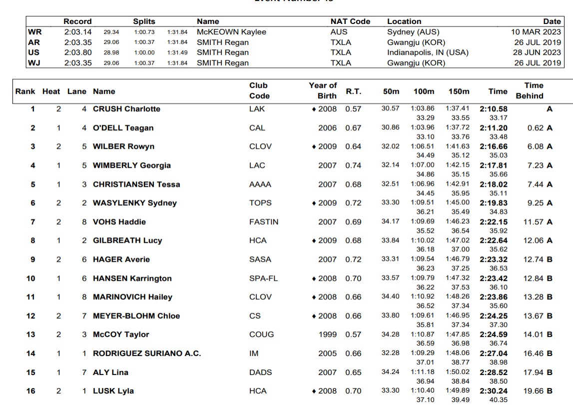 Rowyn Wilber ficou em terceiro nas preliminares com 2m16s68, seguido por Geórgia Wimberly (2:17,81), Tessa Christiansen (2:18.02), Sidney Wasylenko (2:19,83), Hadie Vohs (2:22.15) e Lucy Gilbreath (2:22,64).