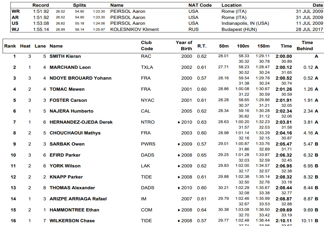 Smith, um especialista americano em meia distância livre, ficou com a primeira colocação com 2h00,00, enquanto Marchand, o medalhista de ouro olímpico francês nas provas IM, ficou logo atrás com 2h00,12.