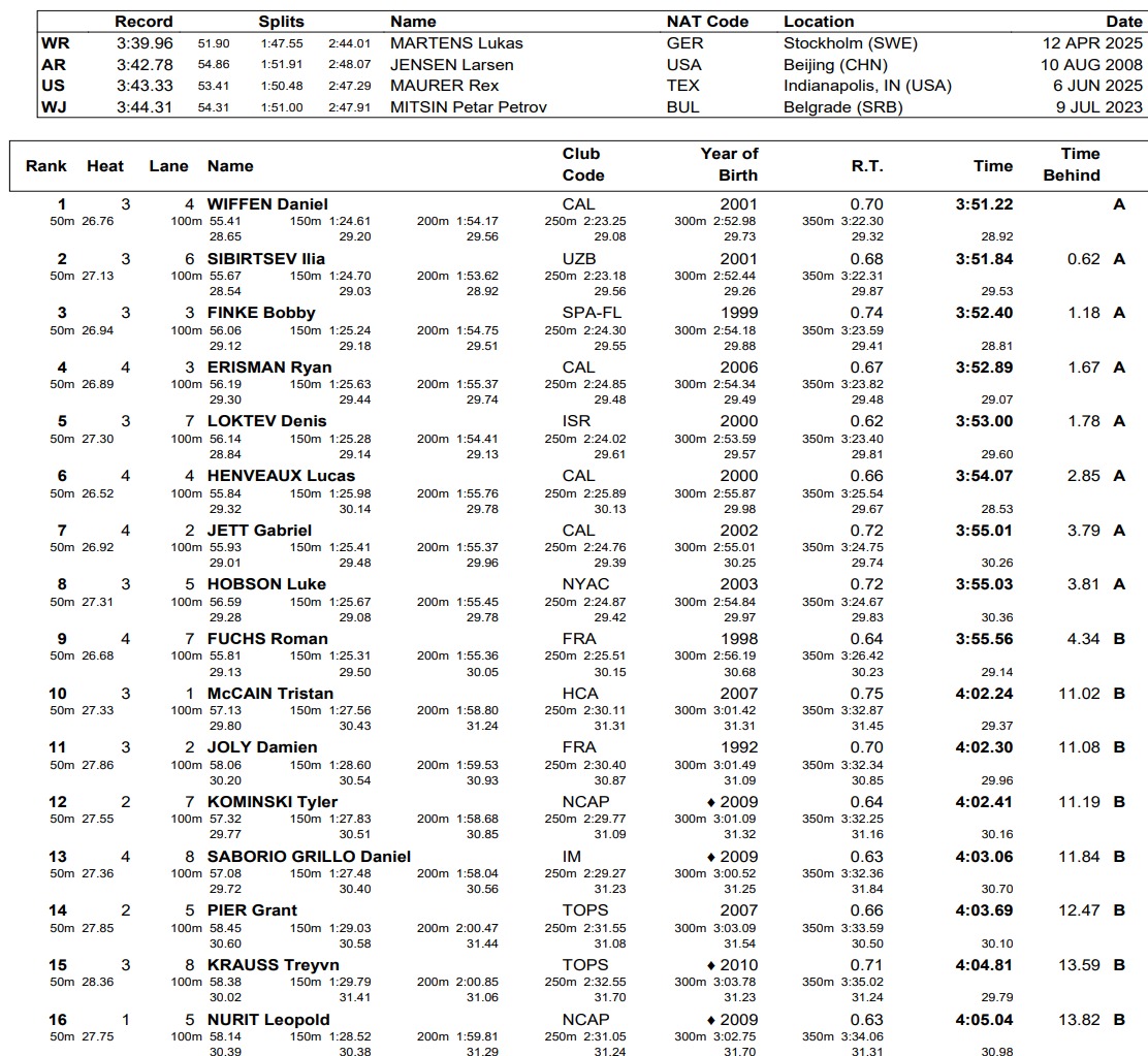 Olímpicos dos EUA Bobby Finke ficou em terceiro lugar com 3m52s40, seguido por Ryan Erisman (3:52,89), Denis Loktev (3:53.00), Cal Lucas Henveaux (3:54,07) e Gabriel Jett (3:55.01) e Olímpico Lucas Hobson (3:55,03).