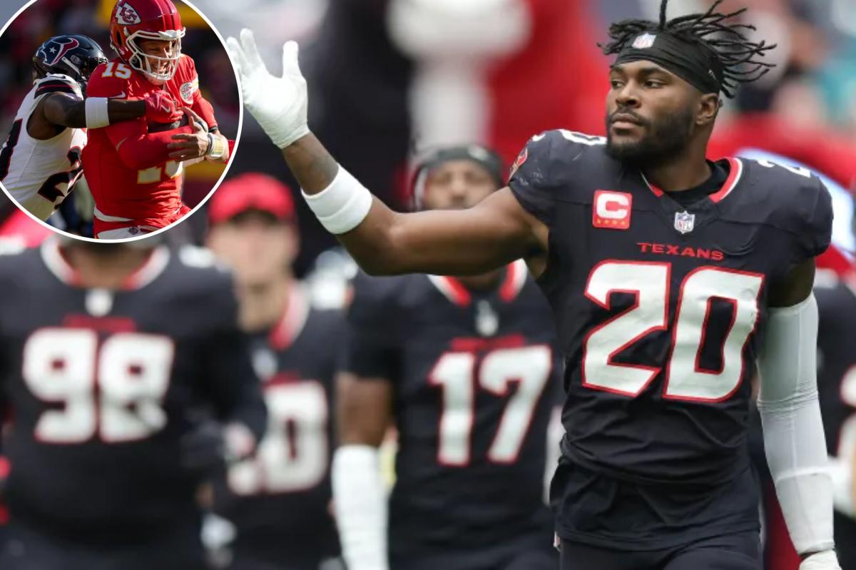Jimmie Ward #20 do Houston Texans joga contra Patrick Mahomes #15 do Kansas City Chiefs durante o primeiro quarto do jogo no GEHA Field no Arrowhead Stadium em 21 de dezembro de 2024 em Kansas City, Missouri. Imagens Getty