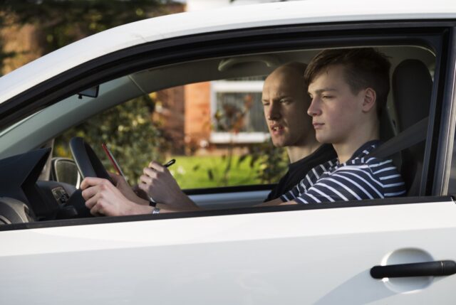 Um homem está ensinando um adolescente a dirigir um carro.