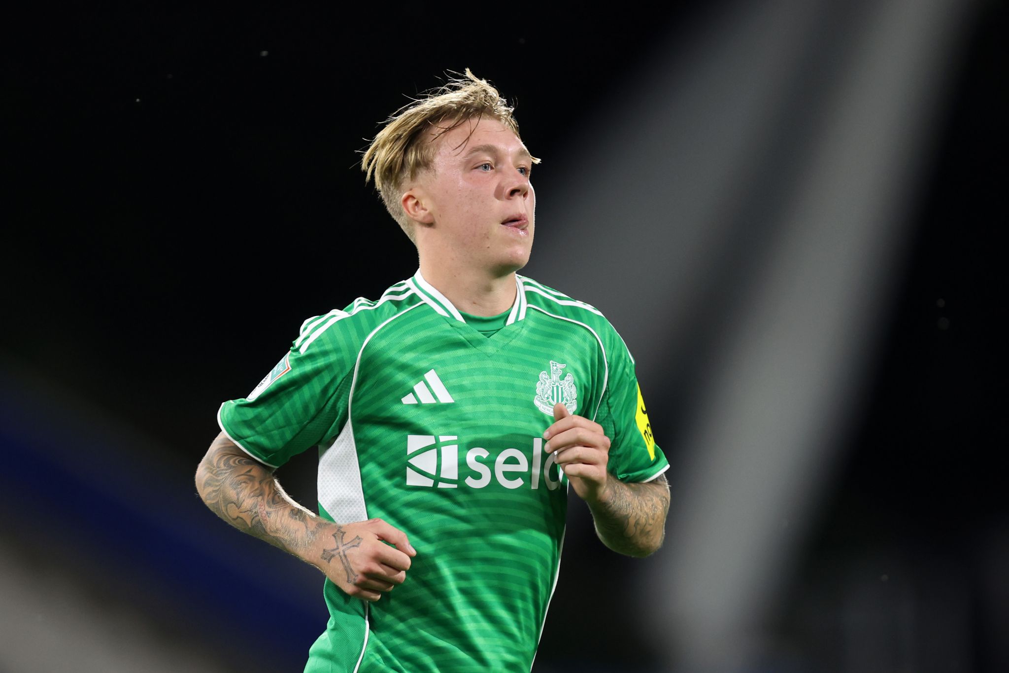 Alfie Harrison, do Newcastle United U21, observa durante a partida do Troféu Vertu. (Foto de George Wood/Getty Images)