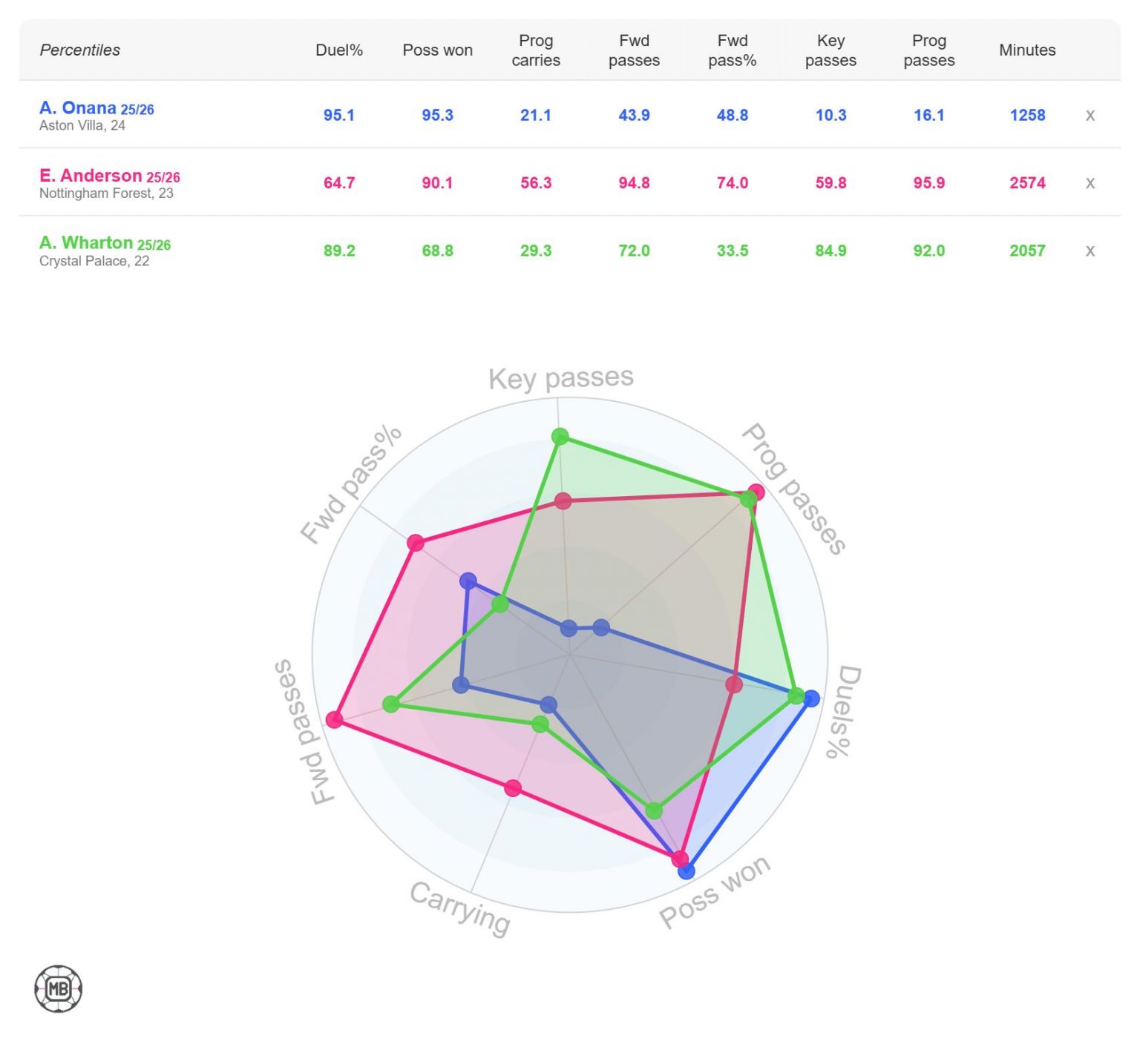 Como você pode ver abaixo, as estatísticas de Onana não se destacam quando comparadas às de Elliot Anderson, do Nottingham Forest, e de Adam Wharton, do Crystal Palace…