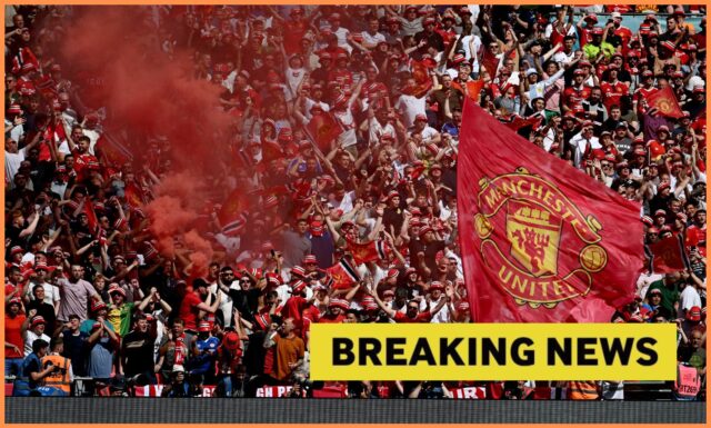 Uma bandeira do Manchester United é agitada nas arquibancadas enquanto um sinalizador queima. (Foto de Mike Hewitt/Getty Images)