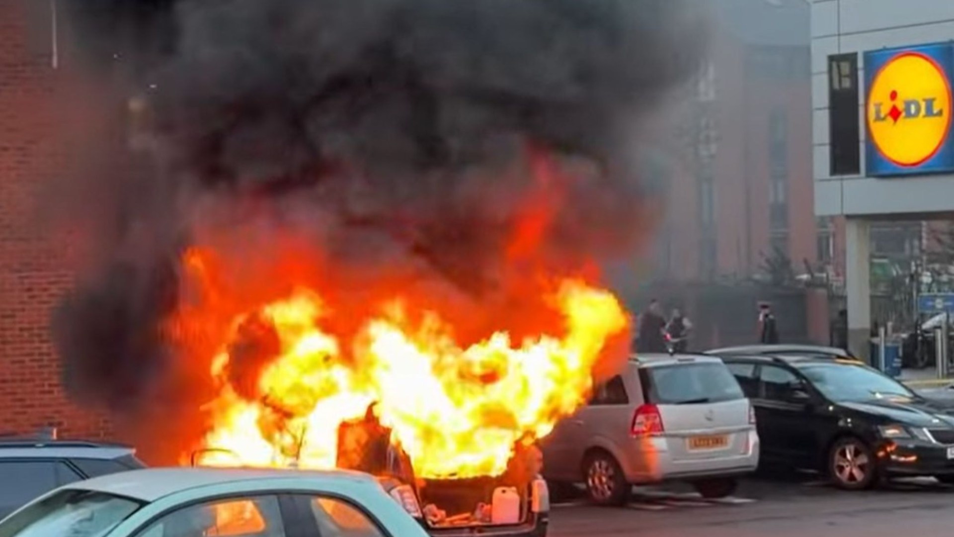 Momento dramático em que um carro foi visto ‘envolto em chamas’ no estacionamento Beeston LidlCrédito: Facebook