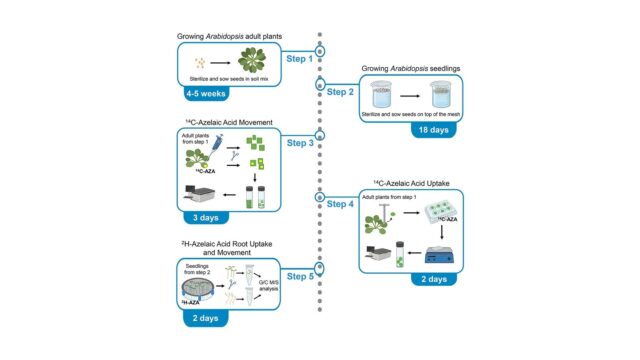 Os cientistas desenvolveram um protocolo para analisar a mobilidade e a absorção de ácido acético marcado isotopicamente em uma planta modelo. Arabidopsis thalianaFornece informações valiosas sobre as respostas imunológicas das plantas. Esta pesquisa é fundamental para compreender como as plantas induzem resistência sistêmica contra patógenos. O protocolo, descrito por Suruchi Roychowdhury e pelo professor Jean Greenberg, concentra-se no estudo da sinalização de defesa do ácido azelaico, molécula que viaja dentro da planta e induz resistência sistêmica em tecidos distantes do local da infecção.