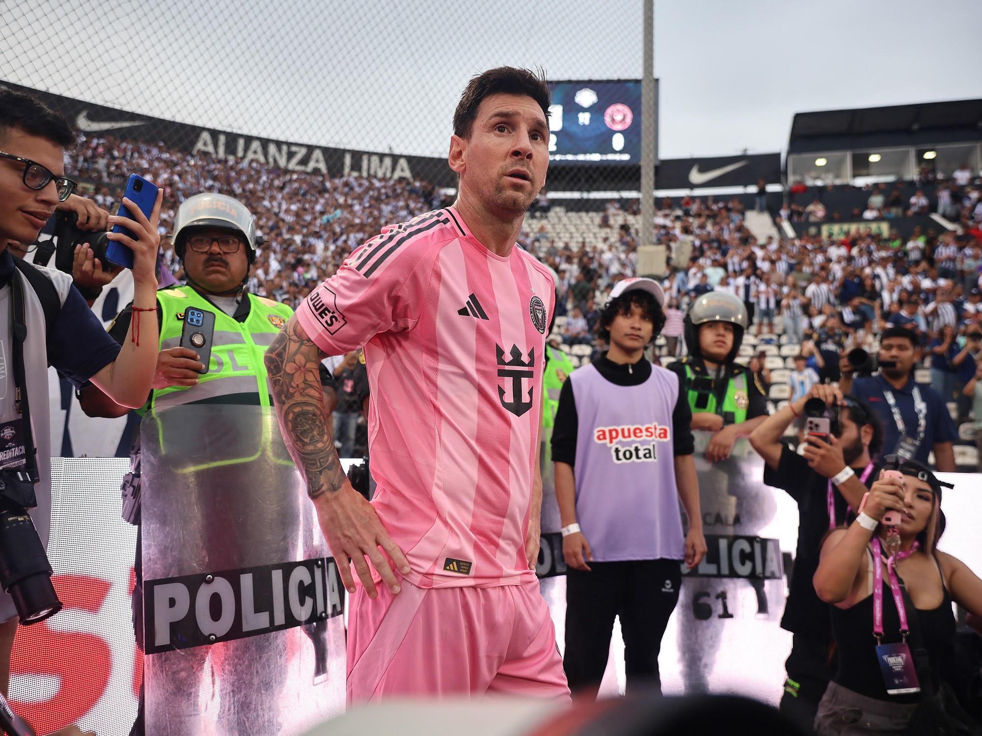 Mas que momento em Lima. Pol Deportes cobre Alianza Lima-Inter Miami. Messi o vê na entrada do estádio e autografa sua camisa.