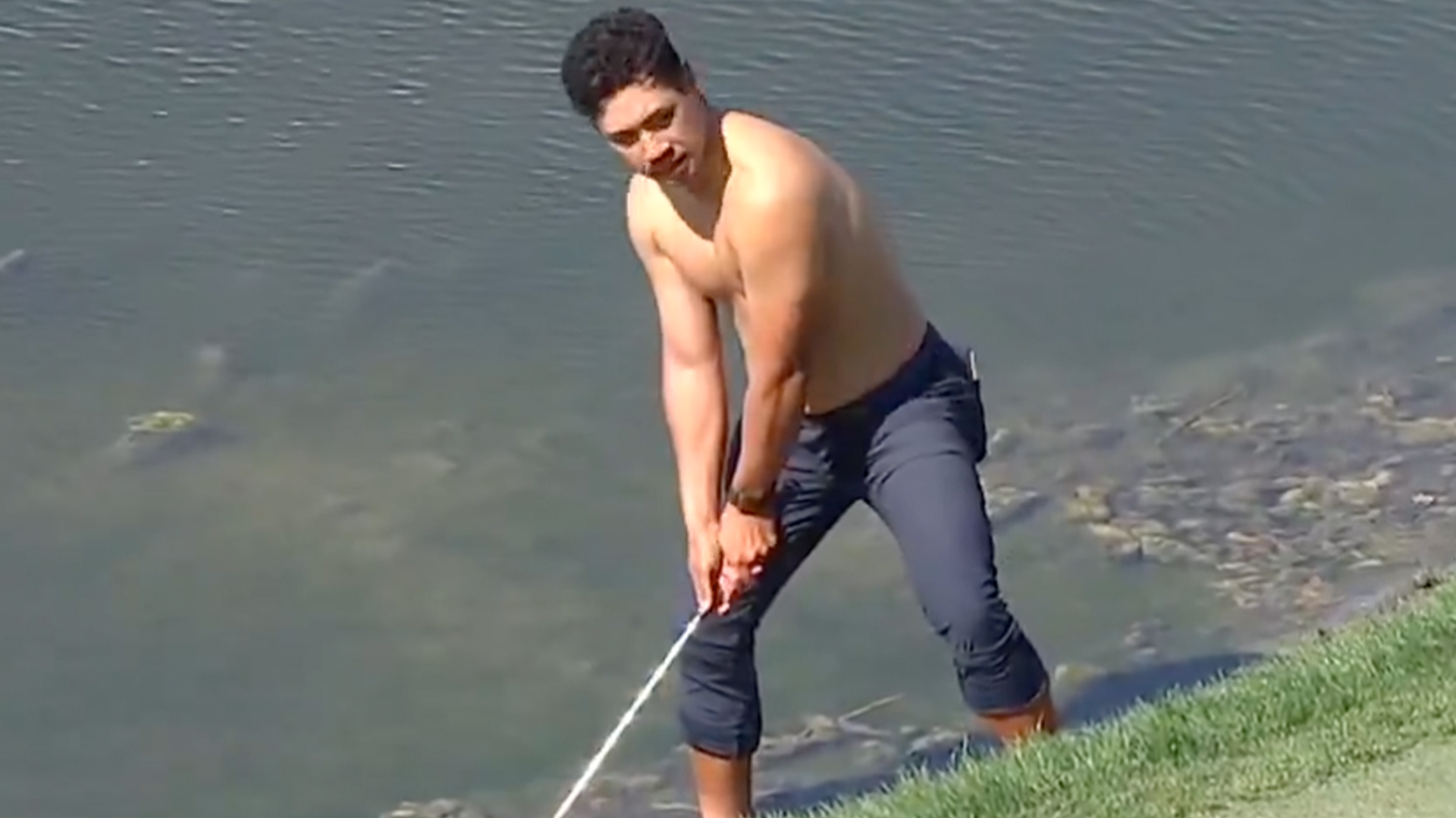 Isaiah Salinda mostra que é possível jogar golfe sem camisa e sapatosFonte: Consulte a fonte