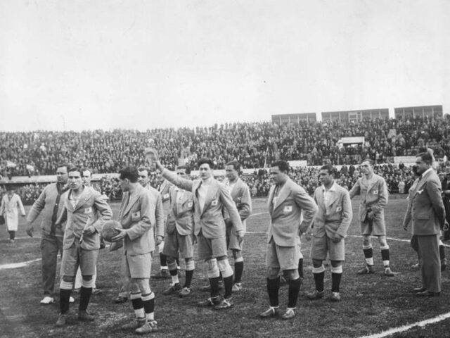 A seleção argentina posa antes da final contra o Uruguai na Copa do Mundo de 1930.O texto, crítico aos dirigentes, continua: “Nossos líderes vivem de esperança. Eles acreditam que ao reunir onze meninos às vésperas do torneio e mandá-los para Montevidéu cumpriram seu dever.” Marini compara a missão do Brasil e do Chile, que já haviam nomeado seus elencos, destacando a necessidade de “vigilância por parte do técnico e treinador”.