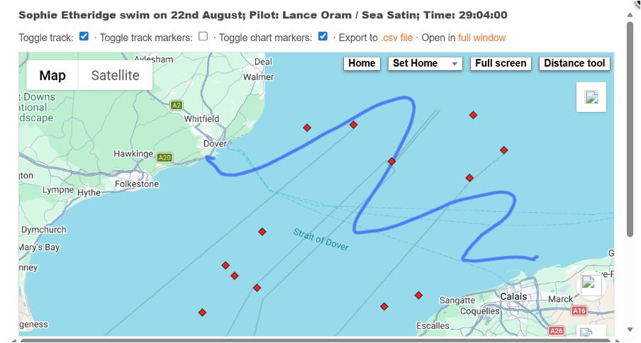 Sophie EtheridgeA Grã-Bretanha estabeleceu o recorde de travessia só de ida mais longa do Canal da Mancha, com 29 horas e 4 minutos. Veja acima o mais rápido que é inferior a 1/4O a hora. As correntes de maré no Canal da Mancha mudam a cada seis horas (ou mais), muitas vezes afastando um nadador da chegada e Sophie completou a natação apesar das deficiências físicas.
