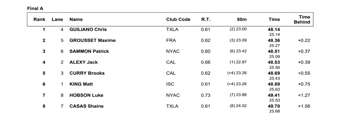 Houve muito poder de fogo na prova final da competição, mas foi o atleta olímpico americano Chris Guiliano que saiu vitorioso nos 100 metros livres. Em segundo lugar na metade da corrida, Guiliano manteve-se forte nos 50 metros finais para sair com a vitória em 48,14. O francês Maxime Grousset ficou em segundo, graças a uma natação de 48,36, enquanto Patrício Convocar (48,51), Jack Alexis (48,53) e Curry de Brooks (48,69) seguiu com 48 marcações centrais.