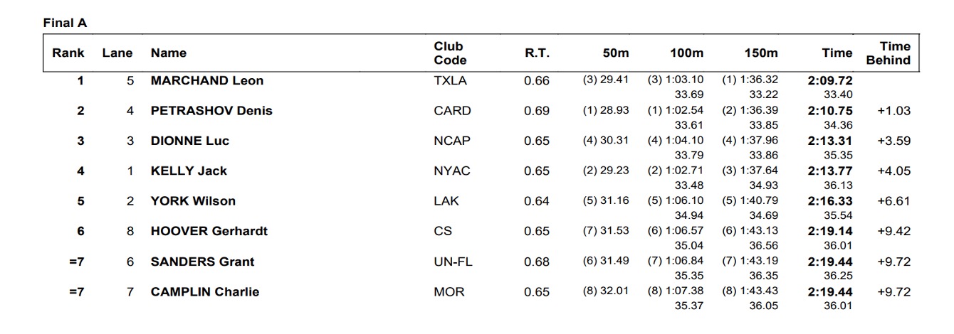 Cal’s Gabriel Jett nunca manteve a liderança na final dos 200 metros borboleta até a reta final, onde conseguiu ultrapassar seu compatriota americano Carson Foster. Jett registrou um tempo de 1:56,44, meio segundo mais rápido que o 1:56,93 produzido por Foster. A diferença estava na volta final, quando Jett fez uma divisão de 30,84, em comparação com 31,42 de Foster, que teve uma vantagem de 0,09 nos 150 metros.