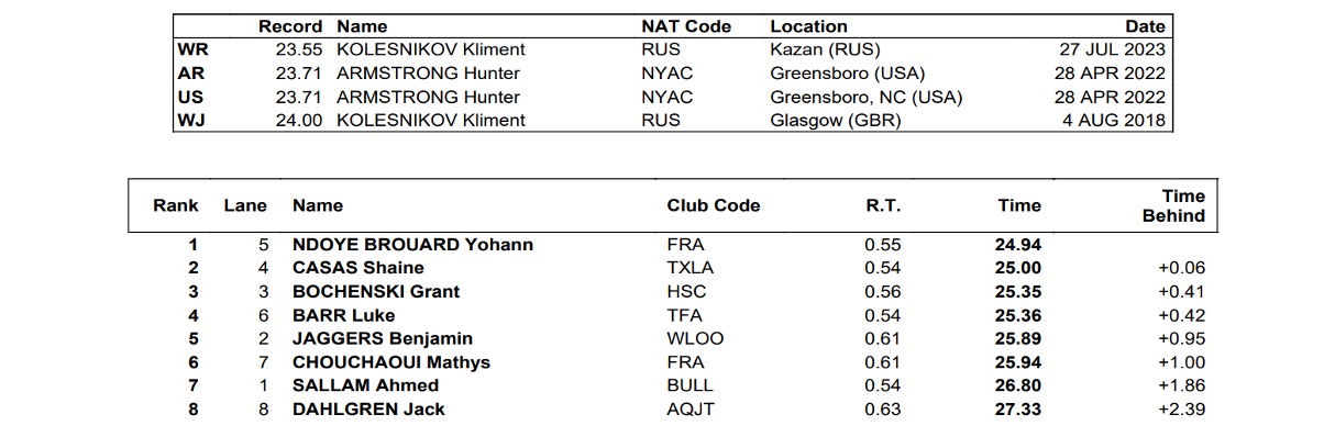 da França Yohann Ndoye Brouard encerrou sua varredura nas provas de nado costas em Austin ao vencer os 50 nado costas em uma batalha acirrada com o americano Shaine Casas. Já vencedor dos 100 costas e dos 200 costas, Ndoye Brouard foi o único nadador a quebrar a barreira dos 25 segundos, com 24,94. Esse desempenho foi suficiente para vencer Casas, que marcou 25,00.
