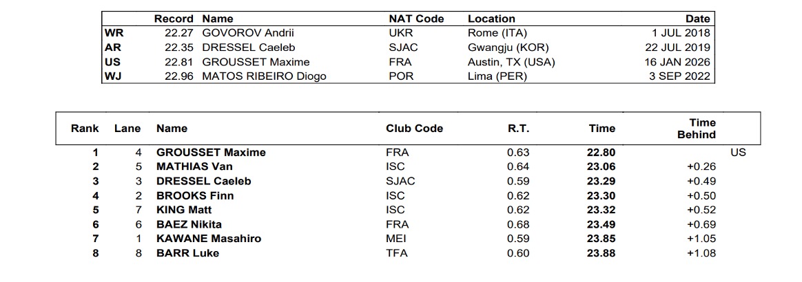 Pelo segundo dia consecutivo, o francês Maxime Grousset registrou um recorde no Aberto dos Estados Unidos nos 50 borboleta, desta vez com um desempenho de 22,80. O tempo de Grousset reduziu em 0,01 o recorde que ele estabeleceu nas semifinais e deu ao atual campeão mundial uma vitória dominante. EUA De Mathias continuou a mostrar sua habilidade de sprint ao terminar em segundo em 23,06. No início da competição, Mathias venceu os 50 nado peito.