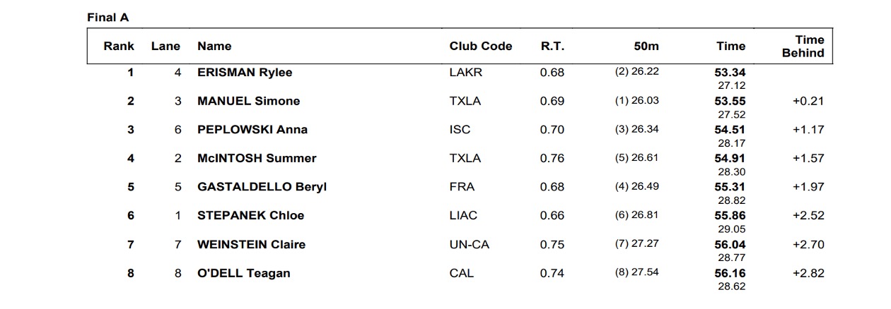 Adolescente americano criado Rylee Erismanuma recruta de Cal, conquistou uma vitória inesperada nos 100 metros livres para encerrar o evento feminino em Austin. Erisman venceu a corrida em 53,34, eliminando outro déficit de 0,19 Simão Manuel nos últimos 50 metros. Co-campeão olímpico de 2016 nos 100 metros livres, Manuel ficou em segundo lugar com 53,55, marcador de qualidade para meados de janeiro.