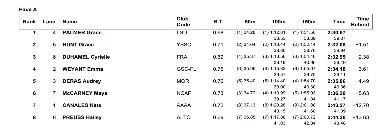 Grace Palmer foi a vencedora fio a fio nos 200 metros peito, quando a atleta da LSU nadou 2m30s57, dando-lhe uma margem de vitória de 1,51 segundos. graça caça ficou em segundo lugar com 2m32s08.