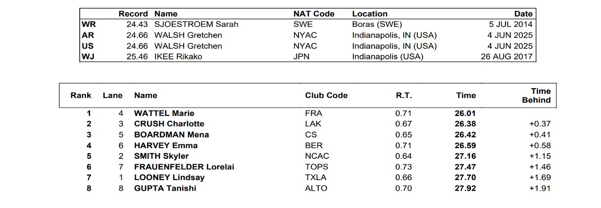 da França Maria Wattel guardou seu melhor para a rodada final de 50 borboleta. Depois de passar pelas eliminatórias e semifinais na sexta-feira, Wattel fez 26,01 para conquistar a vitória na noite de sábado. O tempo de Wattel ficou confortavelmente à frente dos 26,38 do americano Charlotte Esmagamento para o segundo lugar.