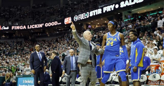 O técnico da UCLA, Mick Cronin, abriu os braços e reclamou ao ver os Bruins perderem para o Michigan State na terça-feira em East Lansing, Michigan.