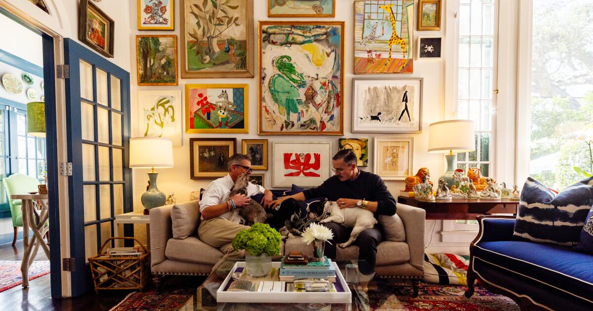 Enrolados em um sofá vintage que encontraram em uma loja de sucata de Long Island, o casal restaurado gosta de relembrar seus 22 anos juntos. Isso inclui placas de cachorro da Hermès encontradas no Japão e as pinturas de circo de Denes de Holesch, a quem Quillian chamou de “Picasso Húngaro”.