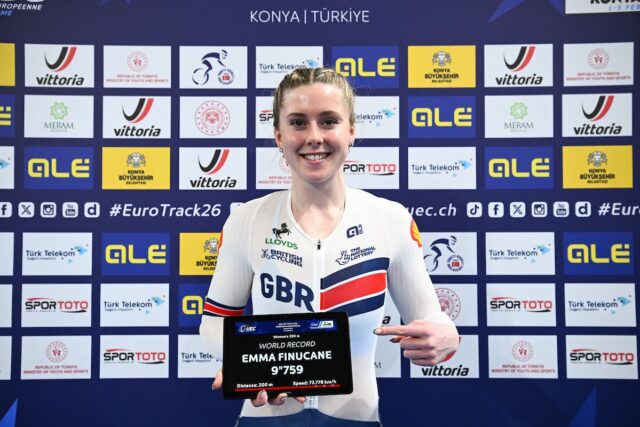 Os pilotos britânicos quebraram três recordes no segundo dia do Campeonato Europeu de Pista da UEC. em Konya, Turquia, na segunda-feira. com a velocista Emma Finucane quebrando o recorde dos 200m voados estabelecido pela chinesa Yuan Liying e a equipe feminina de perseguição recuperando o recorde dos 4.000m depois de perder para a Alemanha nas Olimpíadas de Tóquio em 2021.