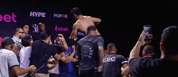 A confusão começou quando Sarkisyan decidiu jogar uma garrafa de água em Peregrino. O brasileiro de repente jogou o mesmo objeto no adversário com ainda mais força. Ao perceber o início da batalha servindo como anfitriões, Prates e Walker se separaram na plateia. Peregrino tira a camisa e caminha em direção ao russo e é controlado. Mas ele se virou. Salte na mesa para atacar seu oponente e caia no chão. Faça Prates rir Enquanto isso Silva comemorava a situação, dançando e até abraçando Mitchell. Depois que este último ameaçou derrubá-lo. Apesar do caos Mas não houve grandes problemas. E nenhum dos lutadores programados para competir na quarta ficou ferido.