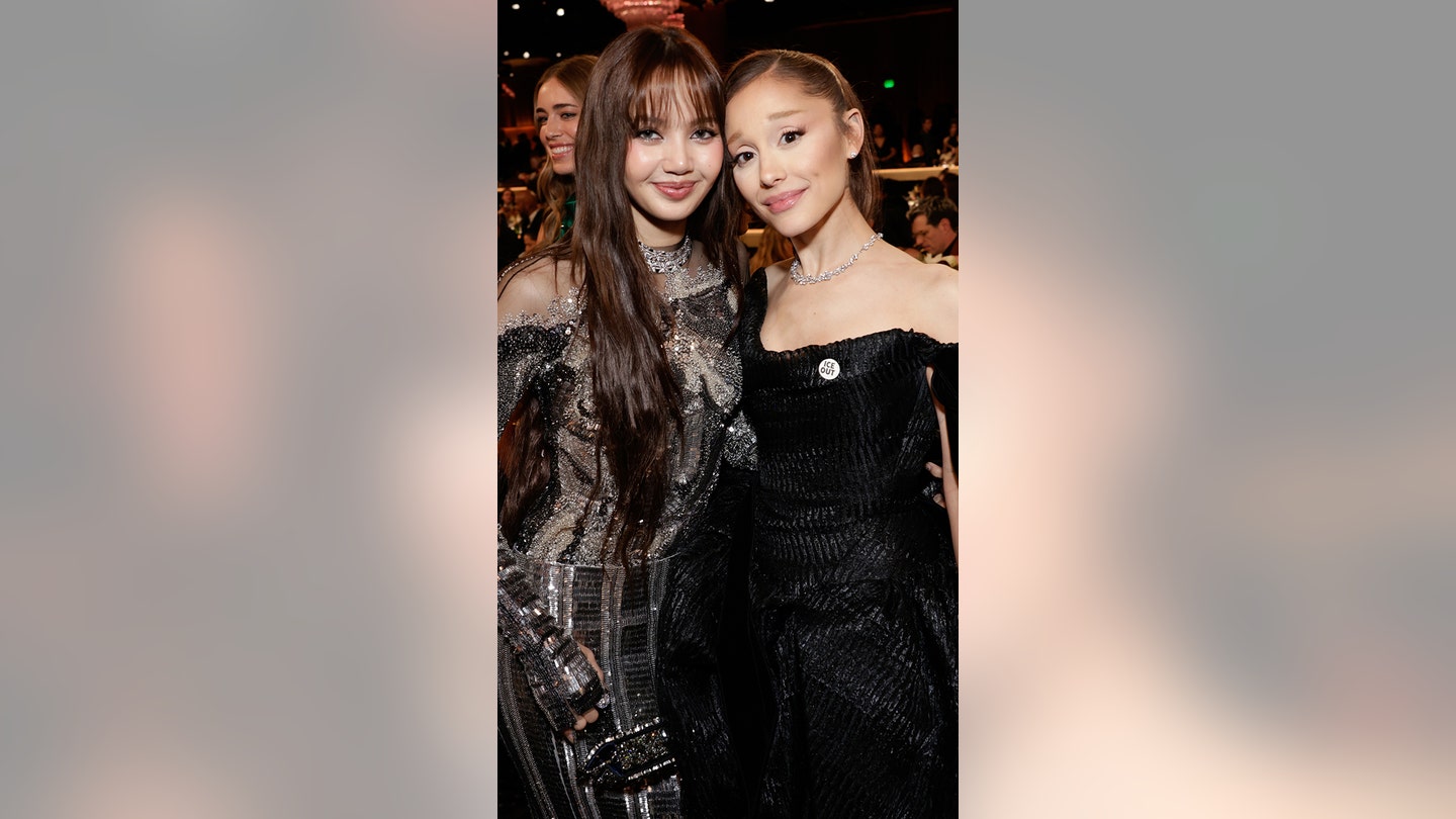 Ariana Grande (à direita) usa um distintivo “ICE OUT” durante o 83º Prêmio Anual do Globo de Ouro no Beverly Hilton em 11 de janeiro de 2026 em Beverly Hills, Califórnia. (Francis Specker/CBS via Getty Images)