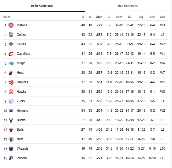 Uma das histórias mais dramáticas da temporada na Conferência Leste foi a do Detroit Pistons. Os Pistons lideraram a conferência com 48 vitórias e 18 derrotas.