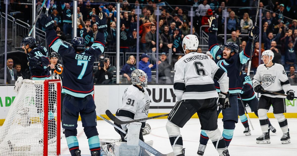 Mas o defensor de Seattle, Ryker Evans, recebeu um duplo menor por seu stick alto, e não demorou muito para os Kings assumirem a liderança faltando apenas 5:20 para o fim do tempo regulamentar. Kevin Fiala fez 2 a 1 e Seattle cobrou o segundo pênalti inteiro, o que eles fizeram.