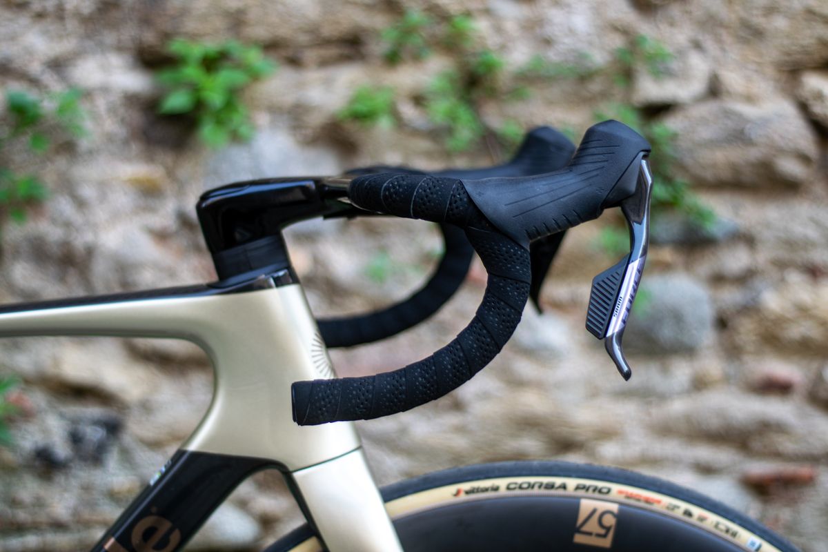 As rodas são aros sobressalentes conectados aos cubos DT Swiss 240, o que é uma combinação formidável. A traseira é apenas uma UCI legal de 64 mm e a dianteira é de 57 mm. As rodas são envoltas em pneus Vittoria Corsa Pro de 29 mm e eu corri sem câmara de ar a 55 PSI com um peso de 65 kg.