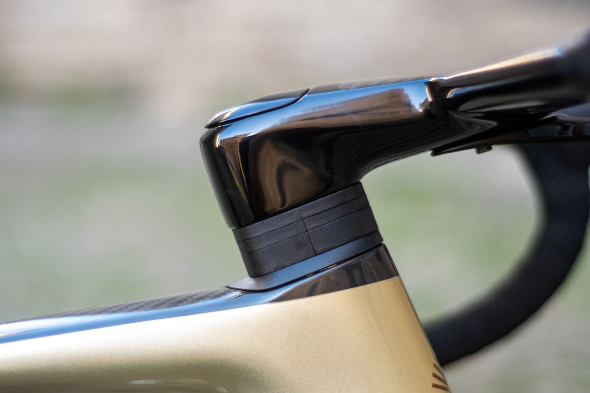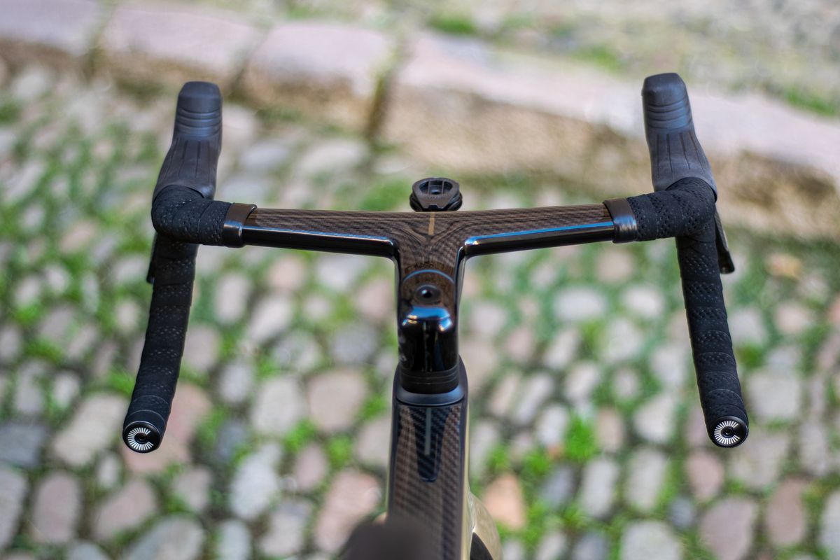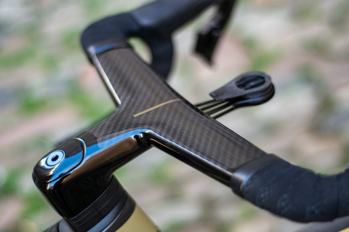 Esta bicicleta é a Evo mais barata que vem com o novo guiador integrado System Bar Road e o acabamento é absolutamente deslumbrante. Acostumei-me a olhar para aquela trama de fibra de carbono todos os dias. Meu guidão tem barras de 100 mm, que geralmente é meu comprimento preferido. É uma versão de 360 mm de largura na parte superior.