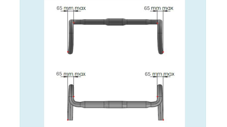 Este é um pouco mais complicado do que na foto. Portanto, incluiremos um diagrama UCI abaixo, mas, para simplificar, a área de ‘queda’ do seu guidão não pode exceder 65 mm na horizontal.