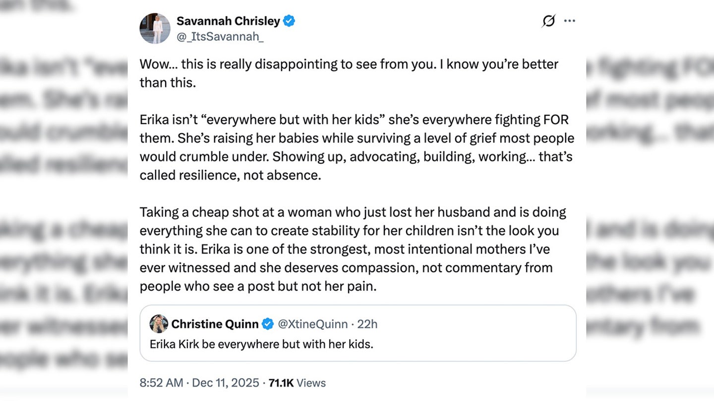 Savannah Chrisley veio em defesa de Erica Kirk depois que outra estrela do reality show criticou a viúva em luto nas redes sociais.