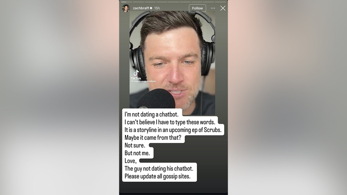 “Não estou namorando um chatbot”, escreveu Braff em sua história, junto com uma captura de tela do podcast. “Não acredito que estou digitando essas palavras. É um ponto de virada em um próximo episódio de ‘Scrubs’. Talvez seja disso? Não tenho certeza. Mas não tenho. Amor, aquele cara não está namorando seu chatbot. Por favor, atualize todos os sites de fofoca.”