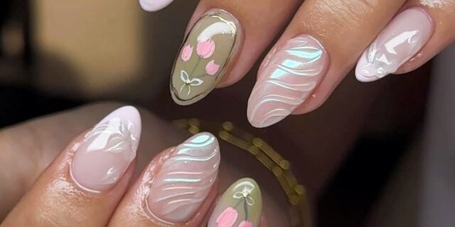Os pastéis primaveris podem realmente ser inovadores, contanto que você escolha tons etéreos como pistache claro e azul celeste. O cromo dourado abstrato e os detalhes aprimorados em gel conferem-lhe uma aparência moderna e escultural.
