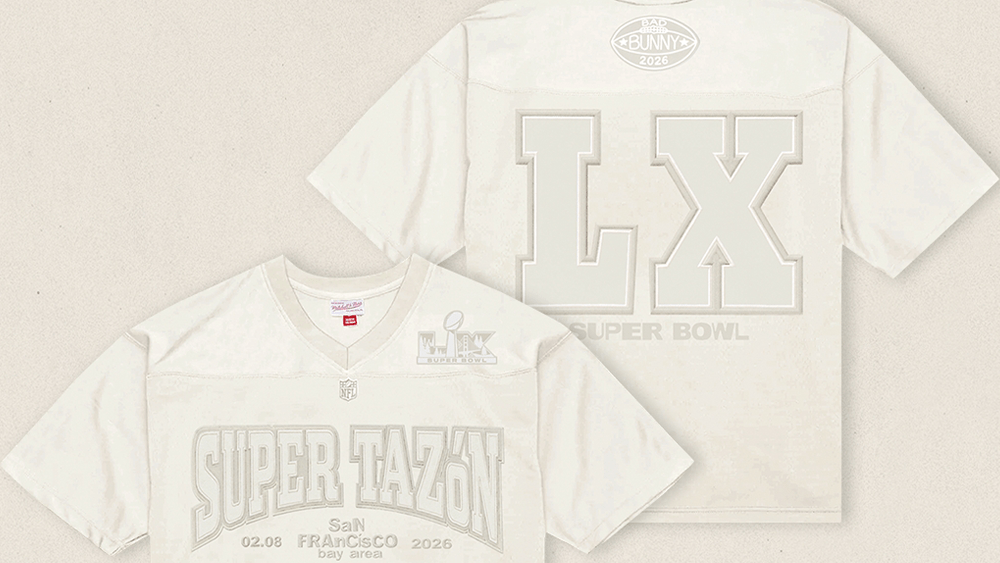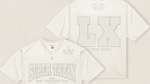 A camisa creme apresenta “Super Tazon” (a tradução espanhola do Super Bowl) na frente, LX Super Bowl nas costas e o logotipo do futebol Bad Bunny abaixo. A marca de roupas esportivas lançará a camisa em quantidades limitadas e atualmente está disponível para pré-encomenda no site da Mitchell & Ness. O produto será enviado oficialmente em 1º de maio.
