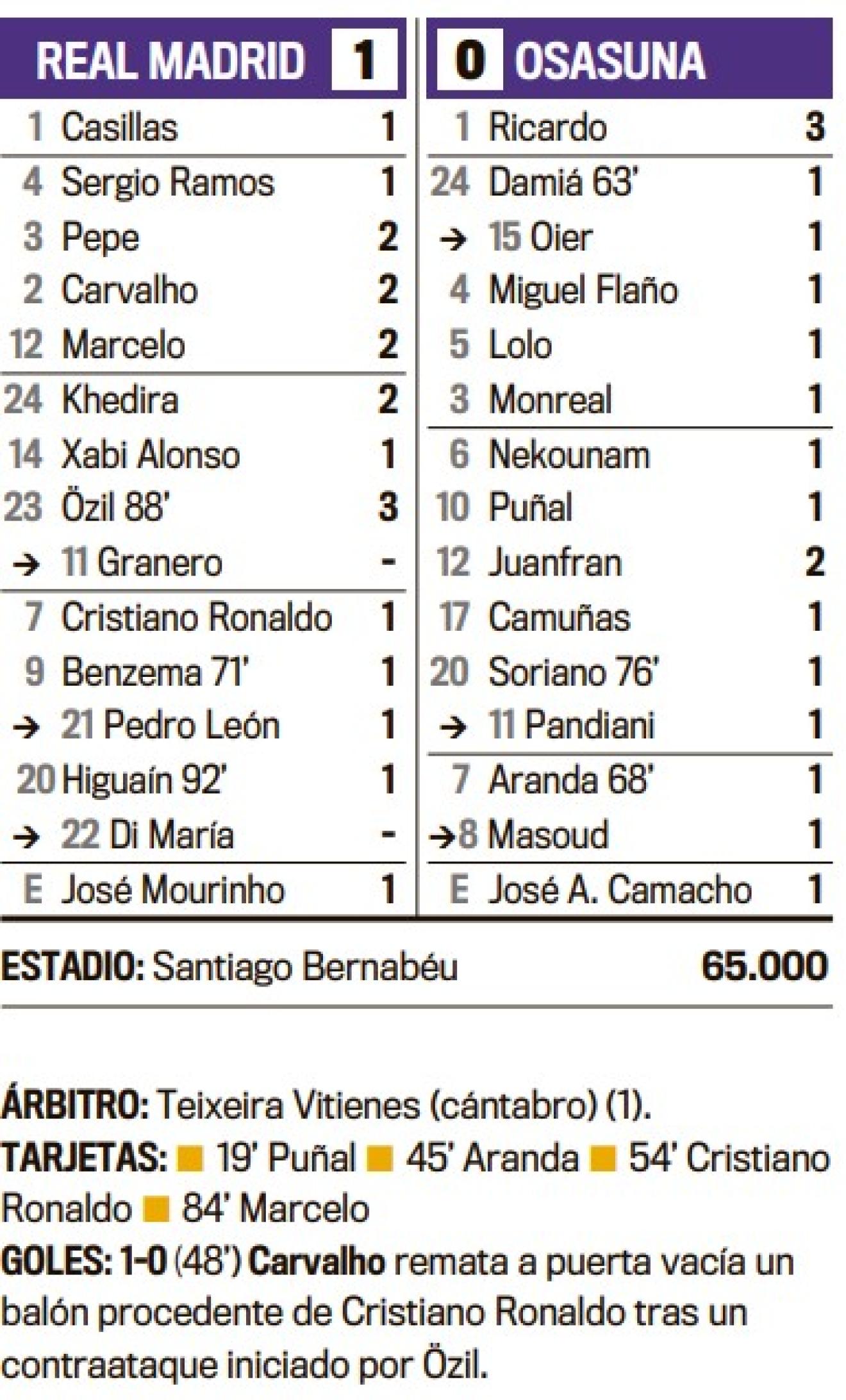 Depois do Chile, que durou apenas uma temporada, veio Mourinho. No primeiro dia empatou em Maiorca. O Bernabeu esperou. Como rival do Osasuna e treinado por José Antonio Camacho, a eterna glória do Clube Branco. O Real Madrid alinhou com um avançado composto por Cristiano Ronaldo, Higuaín e Benzema, embora o único golo tenha sido a extraordinária contratação do central português Carvalho. Xabi Alonso foi titular e Arbelova foi reserva.